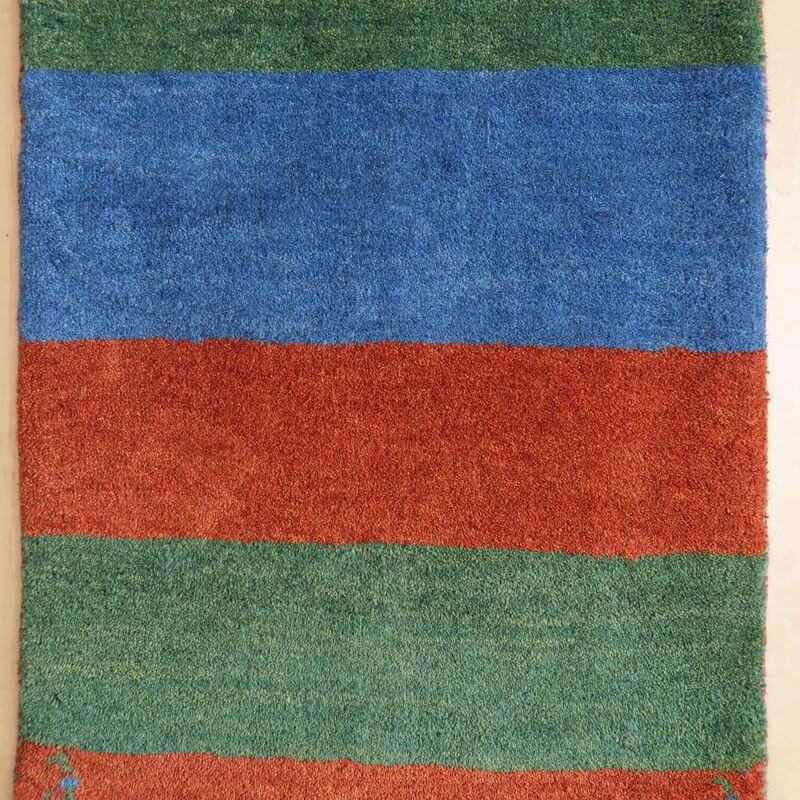 BSS-10783 90×63cm 写真で表示(読み方例:1567=15.67ミリ) イラン・シラーズ ウール ベーシックなギャッベ手織り 無料 グリーン、ブルー、赤のシンプルなボーダーデザイン。
