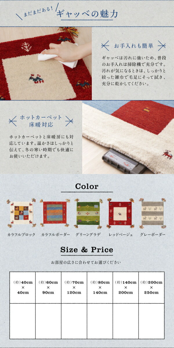 天然素材だから安心、お手入れも簡単 商品名 ウール100%インド製手織りギャッベラグ・マット GABELIA ギャベリア 40×40cm 配送について こちらの商品はメーカーより直送いたします。