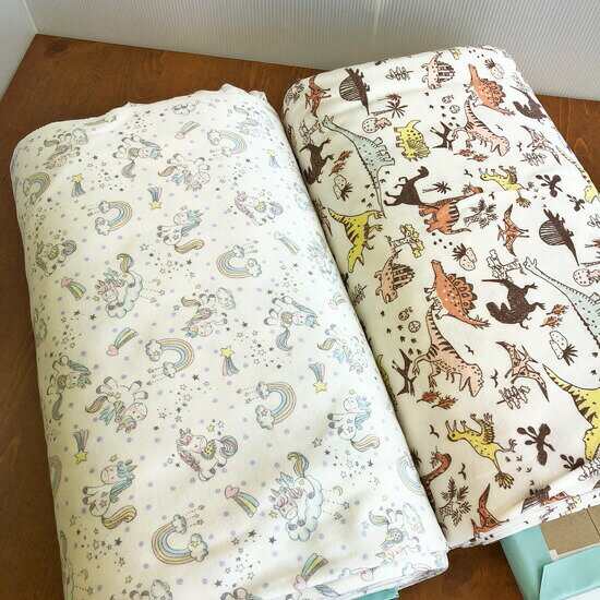 <<ベビースムースシリーズ>> イラストのゆめかわユニコーン柄と恐竜柄のニット生地です。