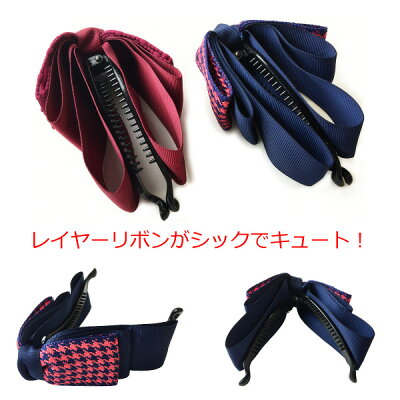 レイヤーリボンバナナクリップ☆ヘアアクセサリー ヘアーアクセサリー ヘアクリップ ヘアークリップ りぼん グログランリボン 千鳥格子 チェック ボーダー 赤 レッド ワイン ブルー 青 紺色 ネイビー 誕生日 プレゼント ギフト メロウストア【メール便配送】