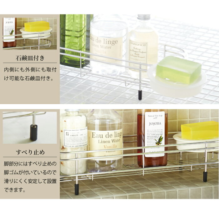 特徴・石鹸皿付き!・さびに強く清潔なステンレス製・チューブや小物も収納できます! サイズ(約) 幅40.8×奥行き12.4×高さ8cm 材 質 本体=ステンレス、石けん皿=ポリプロピレン キャップ=ポリエチレン 耐荷重 5kg 原産国 中国 このカテゴリの商品一覧はこちら▶【バスカウンター】 バスカウンター1段 バスカウンター2段 バスカウンター3段 シャンプーラック3段 【シャワーラック】 1段 2段 3段