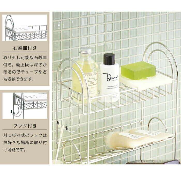 特徴・石鹸皿付き!・小物の掛けられる便利なフック付き! ・さびに強く清潔なステンレス製 ・チューブや小物も収納できます! サイズ(約) 幅26.8×奥行き14.8×高さ41.2cm(フックは含まず) 材 質 本体・フック=18-8ステンレス(SUS304)石けん皿=ポリプロピレンキャップ=ポリエチレン 耐荷重 上段2kg 中・下段3kg フック300g 原産国 中国 このカテゴリの商品一覧はこちら▶【バスカウンター】 バスカウンター1段 バスカウンター2段 バスカウンター3段 シャンプーラック3段 【シャワーラック】 1段 2段 3段