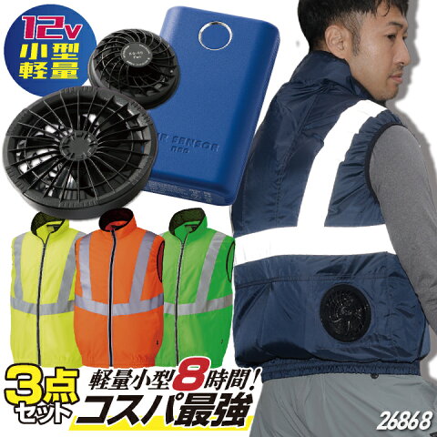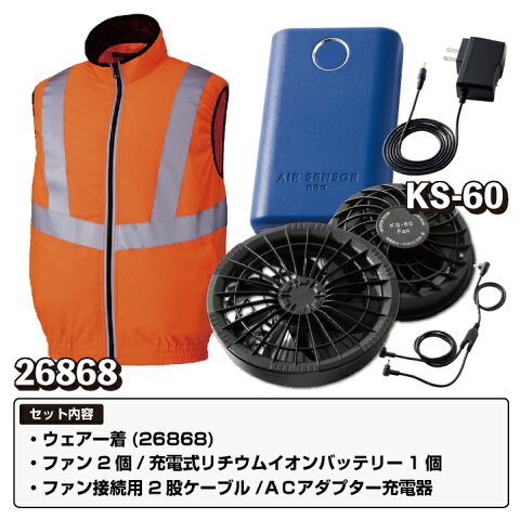 セット内容 空調作業服+ファンセット +バッテリーセット 26868 (高視認反射ベスト) KS-10 (ファン+バッテリー) 素材 ポリエステル100%(タフタ) カラー ネイビー/オレンジ/イエロー/蛍光グリーン サイズ S ・ M ・ L ・ LL 3L ・ 4L ・ 5L オプション加工 ネーム刺繍を入れる ・モニター等の環境による色の誤差や、素材により色ブレが生じる場合があります。
