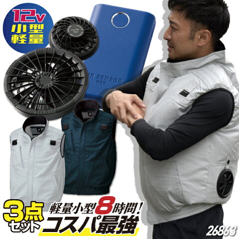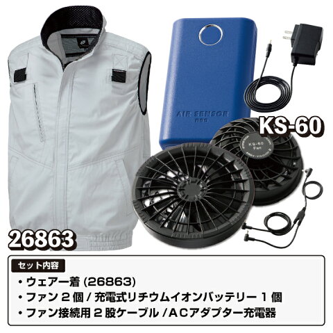 セット内容 空調作業服+ファンセット +バッテリーセット 26863 (ベスト) KS-10 (ファン・バッテリーフルセット) 素材 綿100% (サマーツイル) カラー ネイビー ・ シルバー サイズ SS ・ S ・ M ・ L ・ LL 3L ・ 4L ・ 5L オプション加工 ネーム刺繍を入れる ・モニター等の環境による色の誤差や、素材により色ブレが生じる場合があります。