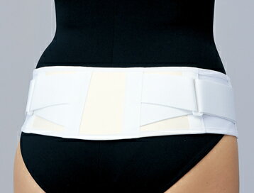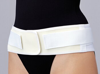 製品丈の短いサポーター本体に、非伸縮性の生地を使用した骨盤ベルトを配置。