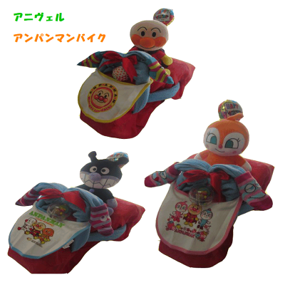 大人気のアンパンマンのバイク おむつケーキです!! 【おむつケーキのセット内容】 ○フェイスタオル ○くつ下 サイズ7cm〜10cm(ランダムになります) ○アンパンマンのがらがら ふるとリンリン音が鳴ります。